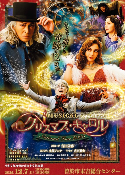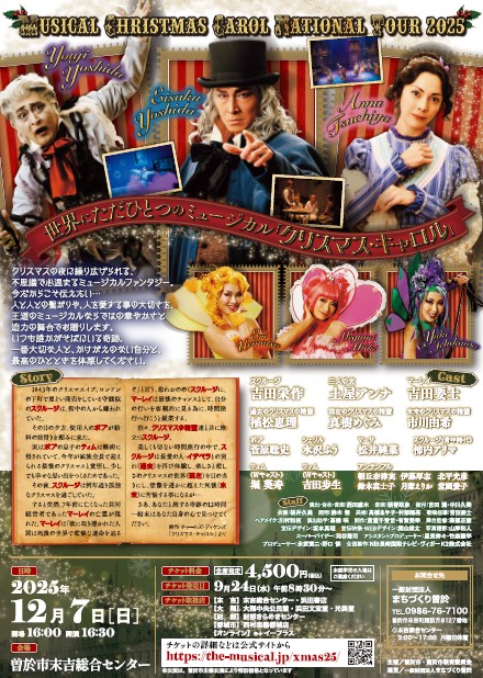 ミュージカル「クリスマスキャロル」開催 2025/10/31 出演は、吉田栄作、土屋アンナ、吉田要士ほか豪華キャスト。ぜひ、ご覧いただきたいミュージカルです。チケット料金は曽於市施行20周年記念特別価格、なんと全席指定4,500円です。ただいま、絶賛発売中です。